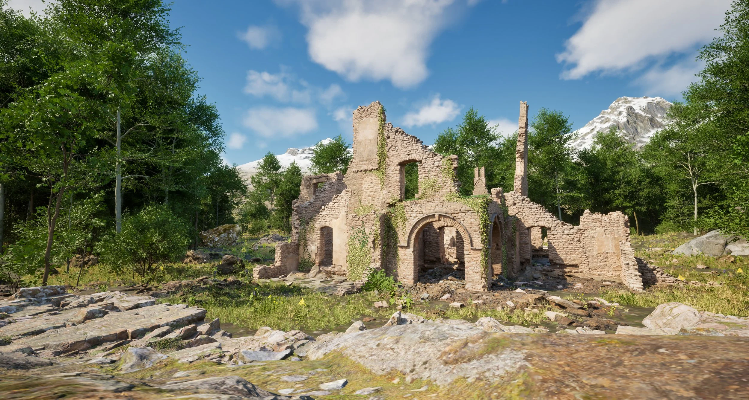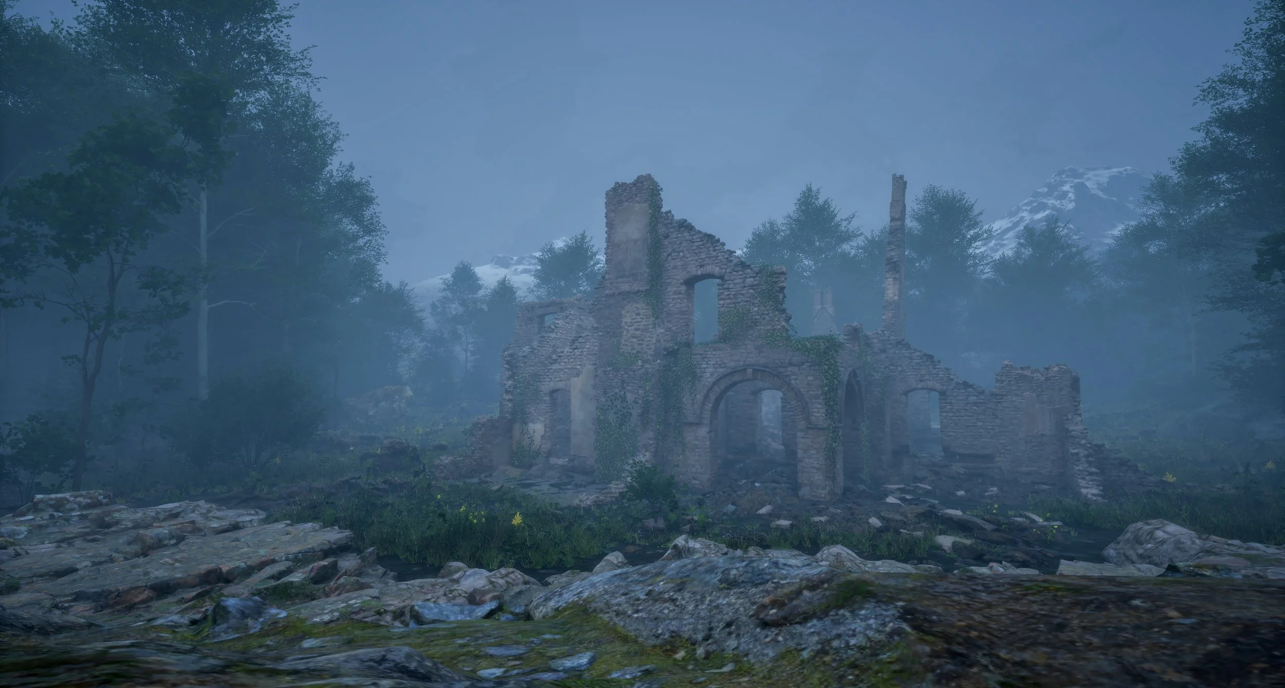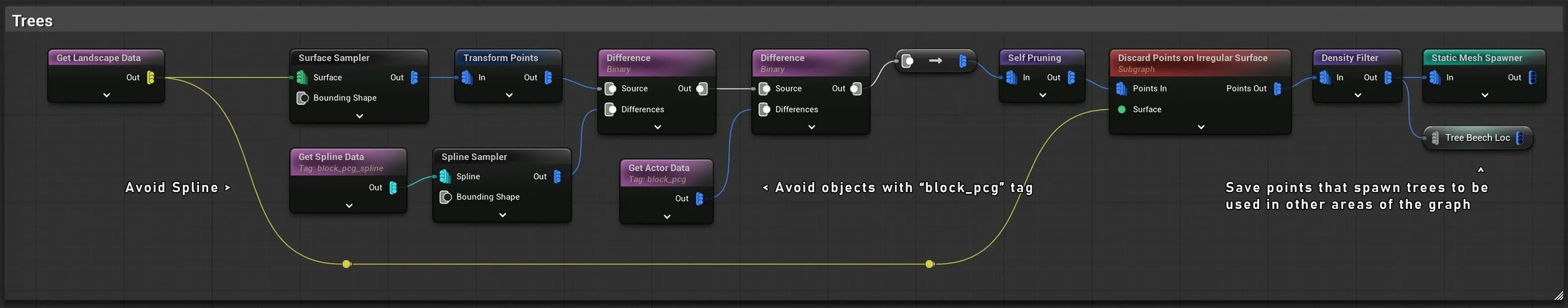 Using Unreal’s PCG I scattered points around the landscape while avoiding larger objects using tags and a clearing around the ruins using a spline.