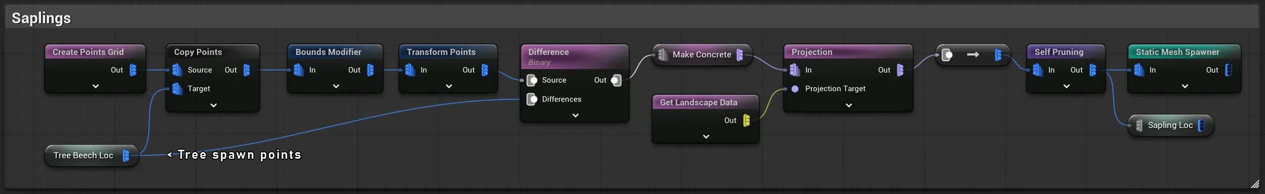 Using the points that generate bigger trees, I created a grid of points around the base to spawn smaller saplings.