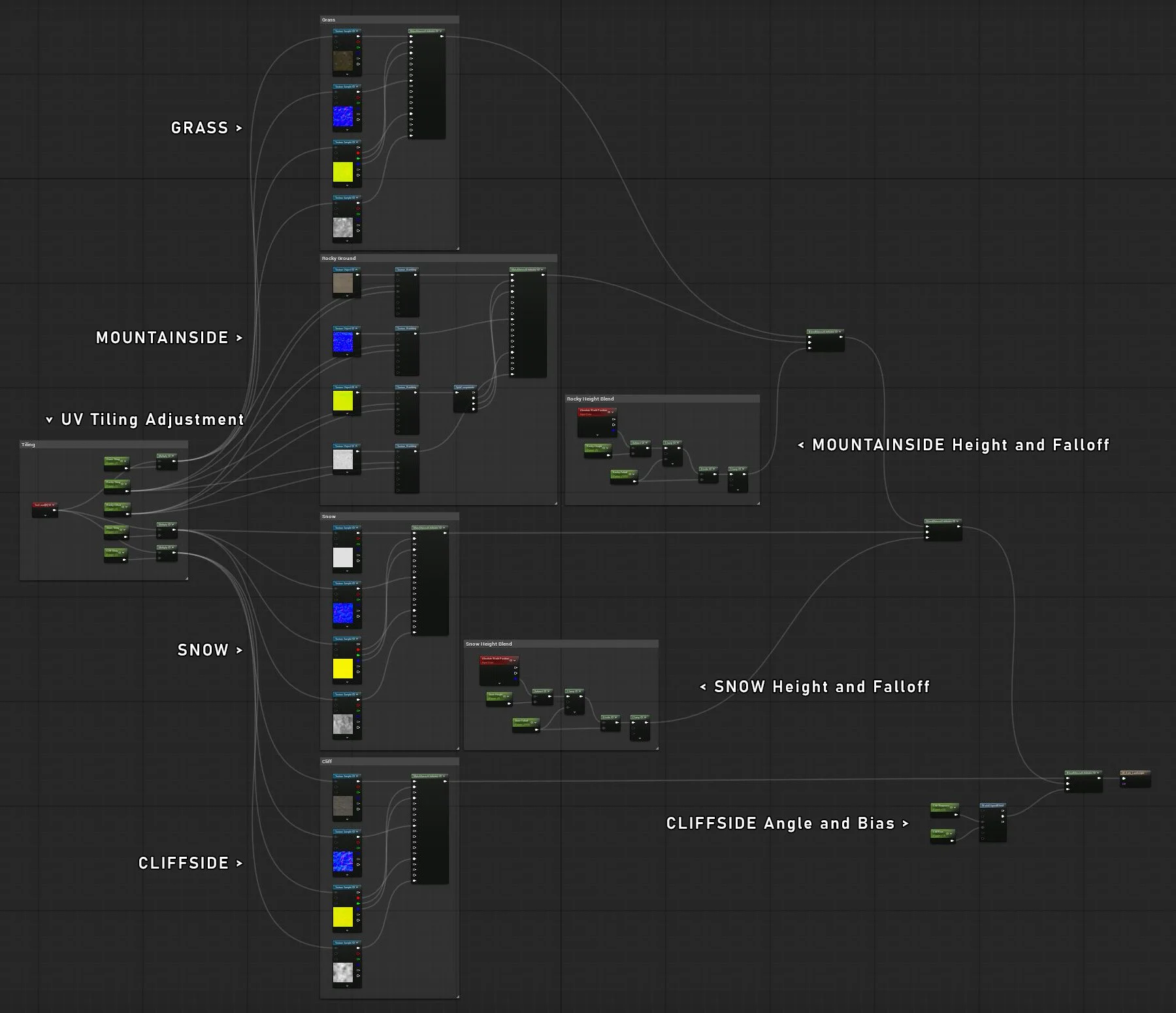 An auto material was applied to the landscape so I could adjust the height and falloff of the snow and the mountain side.